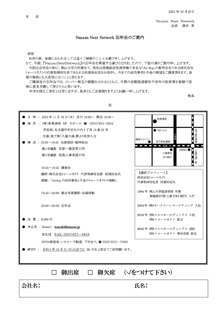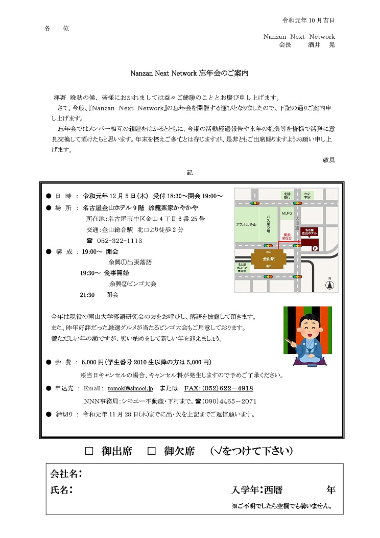 11月30日(木)にNNN忘年会を別紙のご案内の通り開催します。