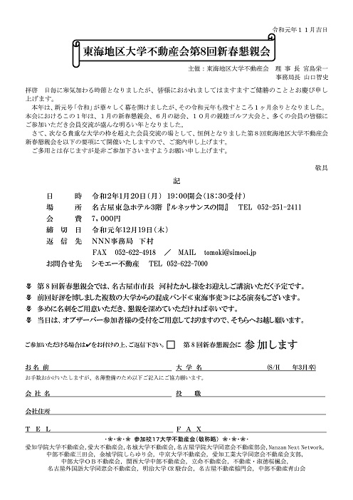 1月20日(月)に東海地区大学不動産会の新春合同懇親会が開催されます。
