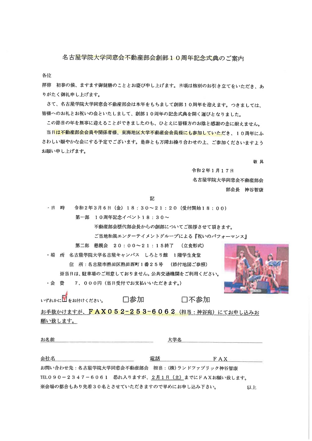 名古屋学院大学同窓会不動産部会 創部10周年記念式典のご案内