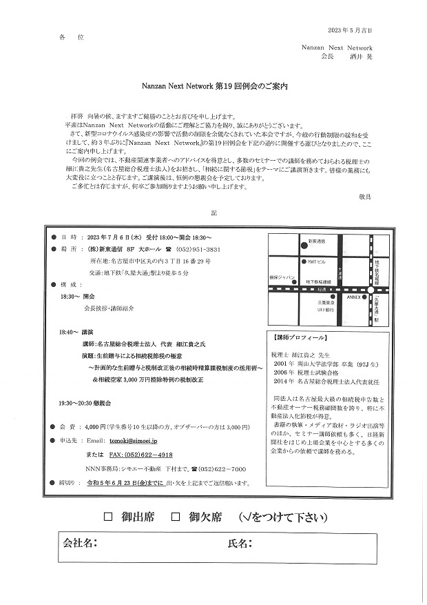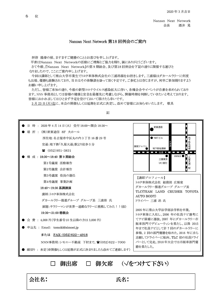 4月14日(火)にNNN第9期総会及び第18回例会の開催を予定しております。