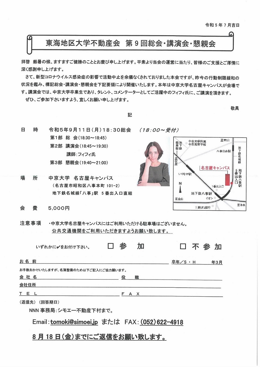 9月11日(月)に東海地区大学不動産会の第9回総会・講演会・懇親会が開催されます。