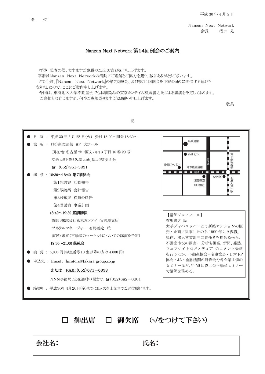 『東海地区大学不動産会 総会・講演会・懇親会』のご案内