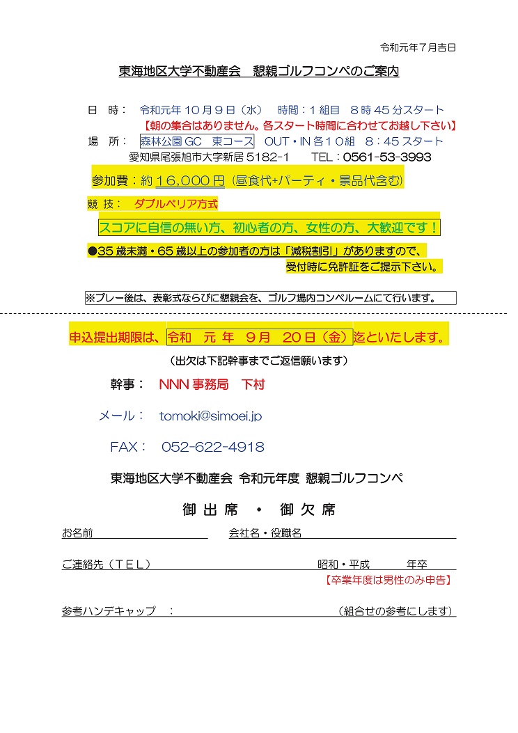 東海地区大学不動産会 懇親ゴルフコンペのご案内